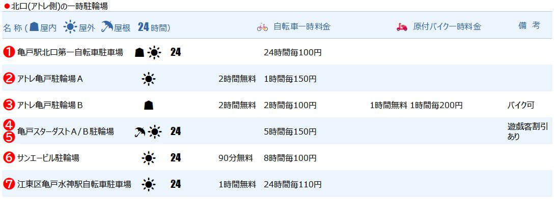 そこで今回は、そんな亀戸駅周辺で一時利用できるおすすめ駐輪場を北口(アトレ側)と東口(京葉道路側)に分けて紹介します。