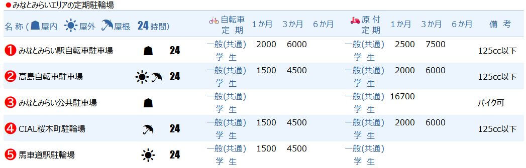 みなとみらいの定期・月極駐輪場まとめ(一覧マップ・料金リスト・各駐輪場プロフィール)
