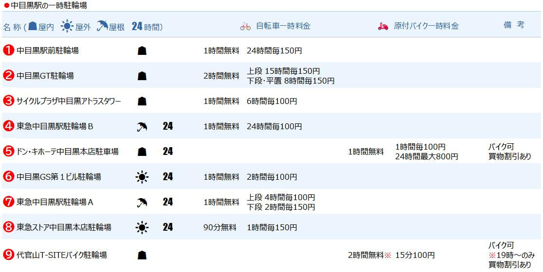 中目黒駅の一時駐輪場まとめ(一覧マップ/料金リスト/各駐輪場プロフィール)