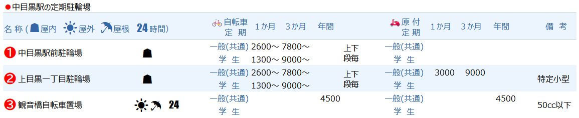 中目黒エリアの定期駐輪場は、月額制の施設(➊❷)や、年間登録制の置場(❸)などが選択肢になりますが、いずれも目黒区の管轄施設になります。