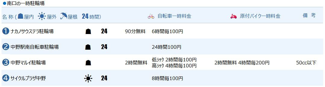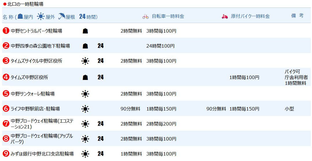 中野駅の一時駐輪場まとめ(一覧マップ / 料金リスト / 各駐輪場プロフィール)