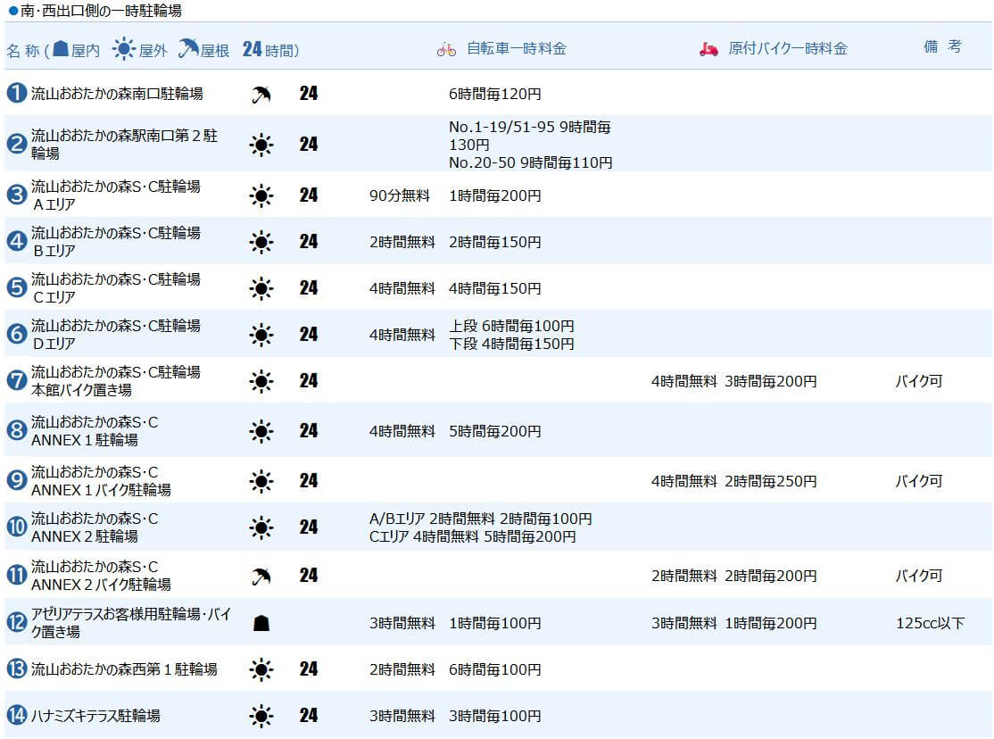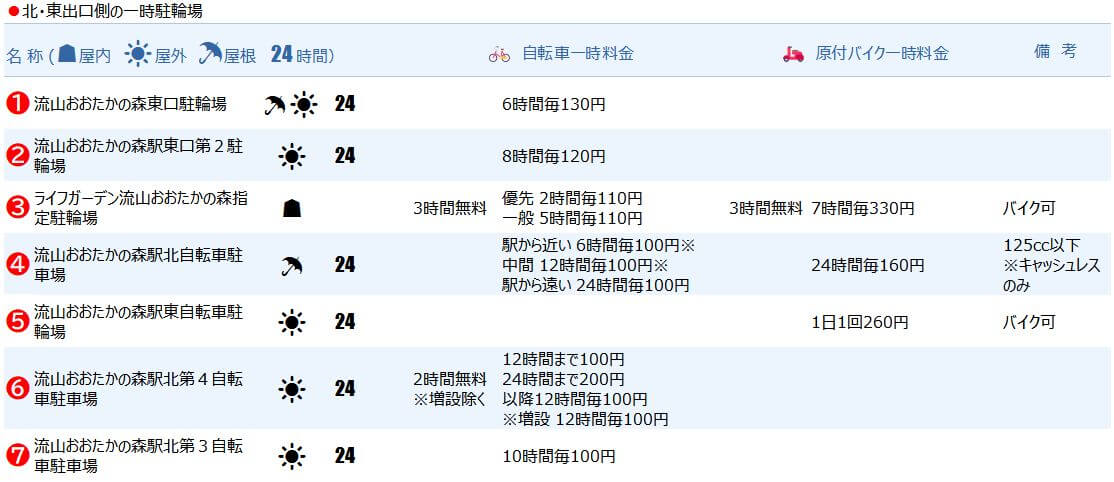 自転車/一時 | ❶ 南口 6時間毎120円 ❷ 南口第2 No.1~19/51~95 9時間毎130円 No.20~50 9時間毎110円 |