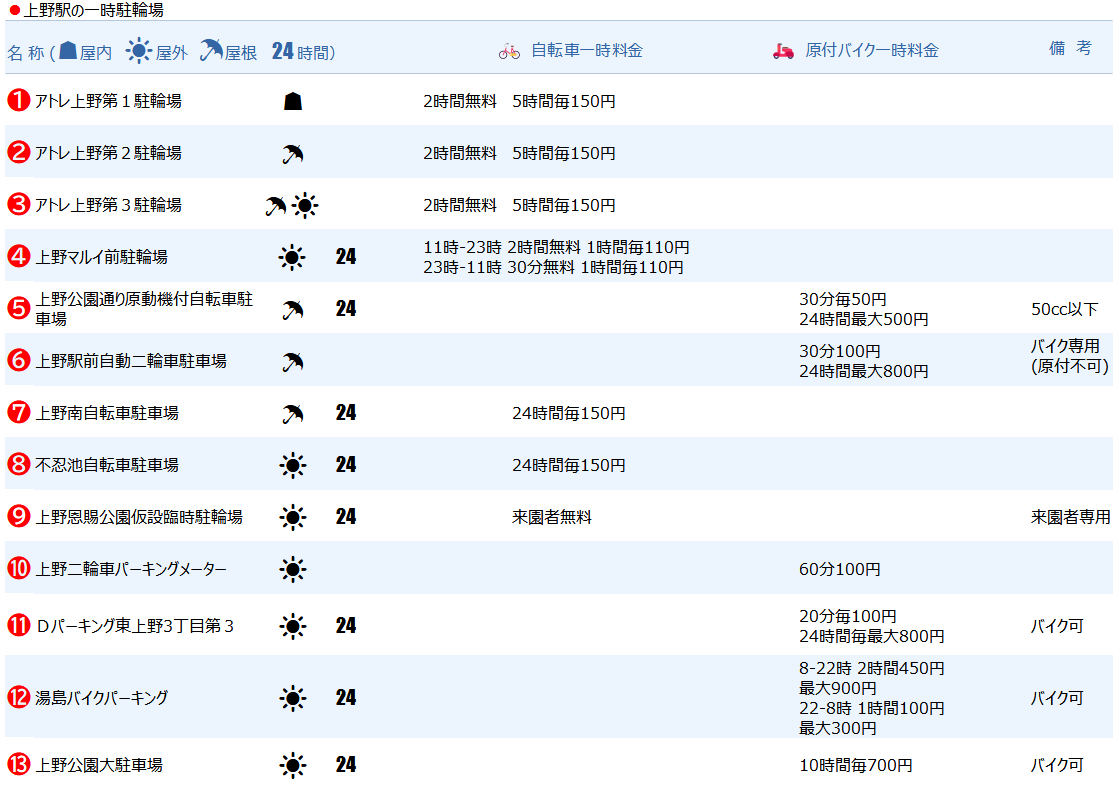 上野駅の一時駐輪場まとめ(一覧マップ/料金リスト/各駐輪場プロフィール)